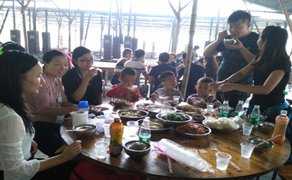 一起分享集體協(xié)作的成果,雞,魚(yú),蝦,排骨等等,對(duì)了,還有餃子,像魔法一樣呈現(xiàn)在大家面前,話(huà)不多說(shuō),趕緊大快朵頤,下午還有更精彩的行程等著我們!