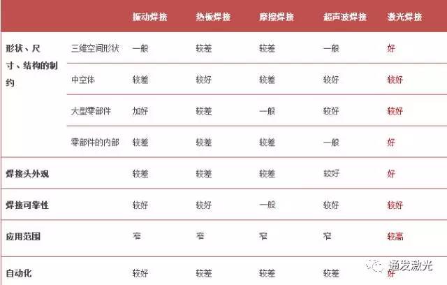 除了以上四種是主要的塑料焊接方法,目前還有一種新型的焊接方式——塑料激光焊接,下面我們先來看與傳統(tǒng)焊接技術(shù)相比,塑料激光焊接到底有哪些突出的地方?如下表