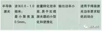 二、半導(dǎo)體激光焊接的光源在激光焊接工藝中,隨著半導(dǎo)體材料工業(yè)的快速發(fā)展,半導(dǎo)體激光作為光源也漸漸得到了應(yīng)用。焊接的特點(diǎn)如表1所示: