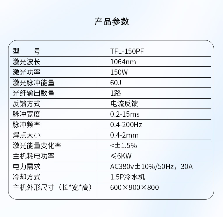 通發(fā)激光TFL-150PF光纖激光焊接機,采用能量反饋控制模式,能量較穩(wěn)定,光纖傳輸光束質量好,適合0.5mm以下金屬不銹鋼板材的精密激光焊接,是批量五金產(chǎn)品中小功率焊接專用機型。