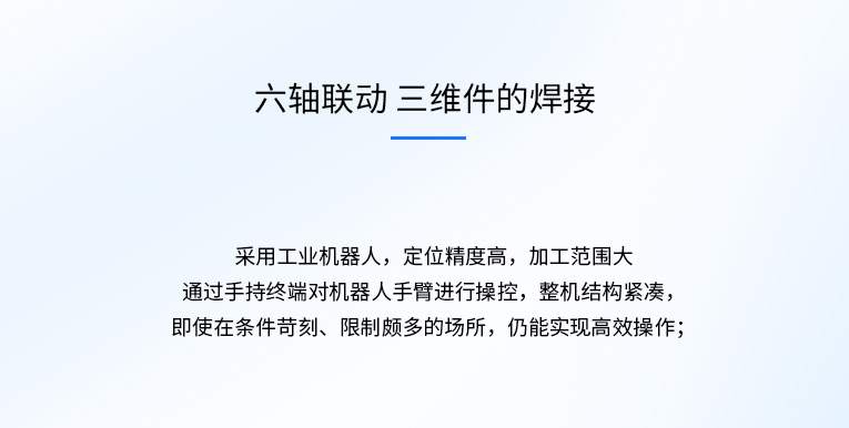 通發激光機械臂機器人激光焊接機,采用機械手六軸聯動,對三維件五金件進行3D精密焊接,非接觸式焊縫跟蹤系統,多工位協調工作,可實生產智能化,自動化,省時省力更省工,全方位降低生產成本。